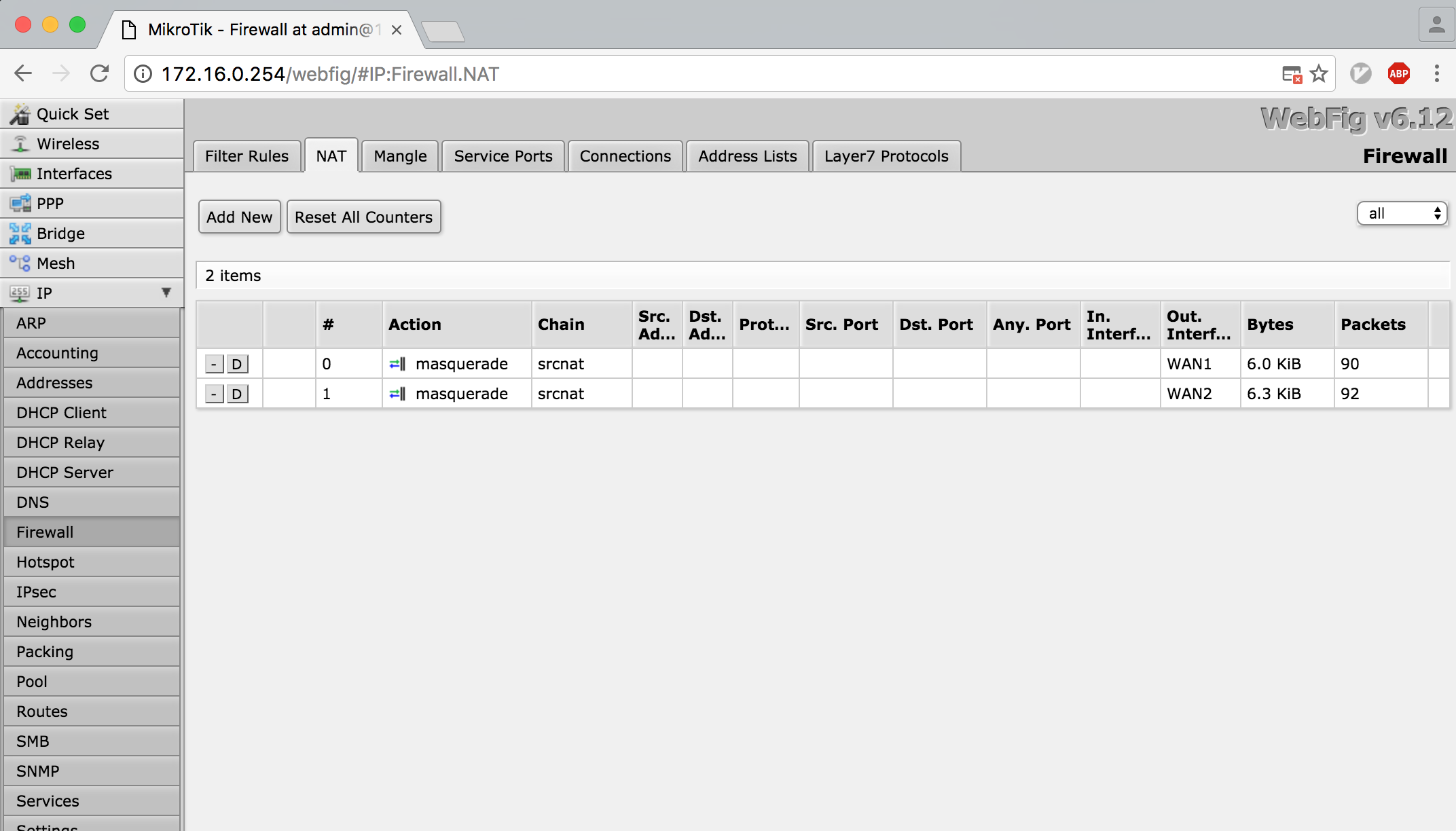 | /ip firewall nat add action=masquerade chain=srcnat out-interface=WAN1 add action=masquerade chain=srcnat out-interface=WAN2