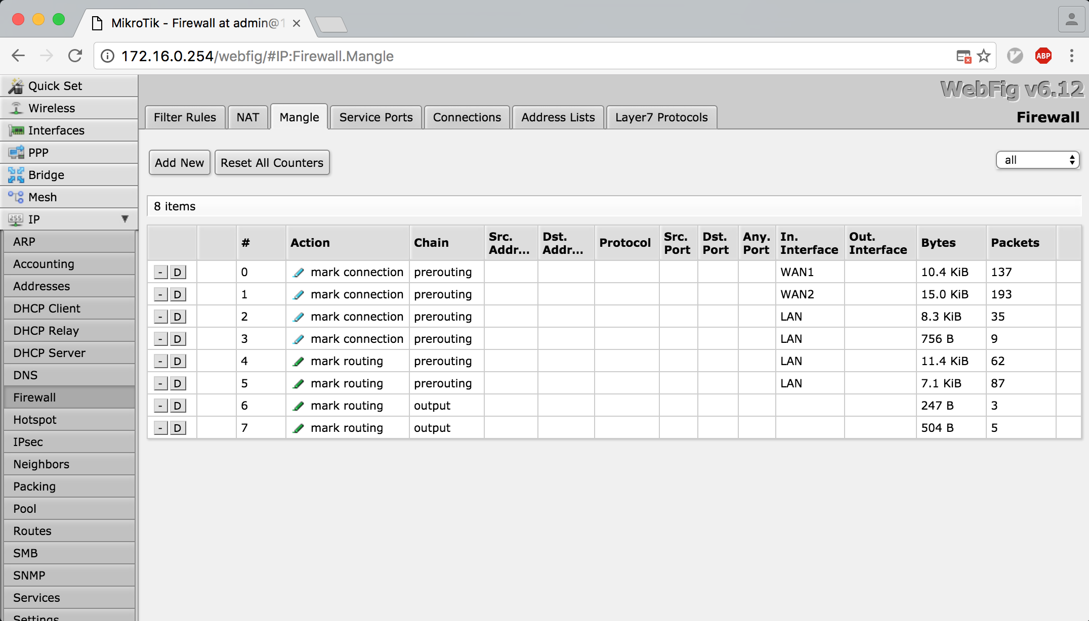 | /ip firewall mangle add action=mark-routing chain=prerouting connection-mark=WAN1_conn \ in-interface=LAN new-routing-mark=to_WAN1 add action=mark-routing chain=prerouting connection-mark=WAN2_conn \ in-interface=LAN new-routing-mark=to_WAN2 add action=mark-routing chain=output connection-mark=WAN1_conn \ new-routing-mark=to_WAN1 add action=mark-routing chain=output connection-mark=WAN2_conn \ new-routing-mark=to_WAN2